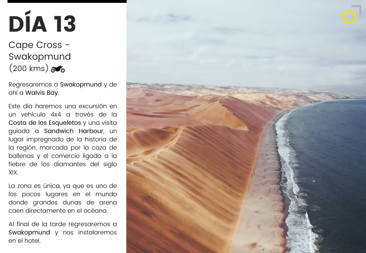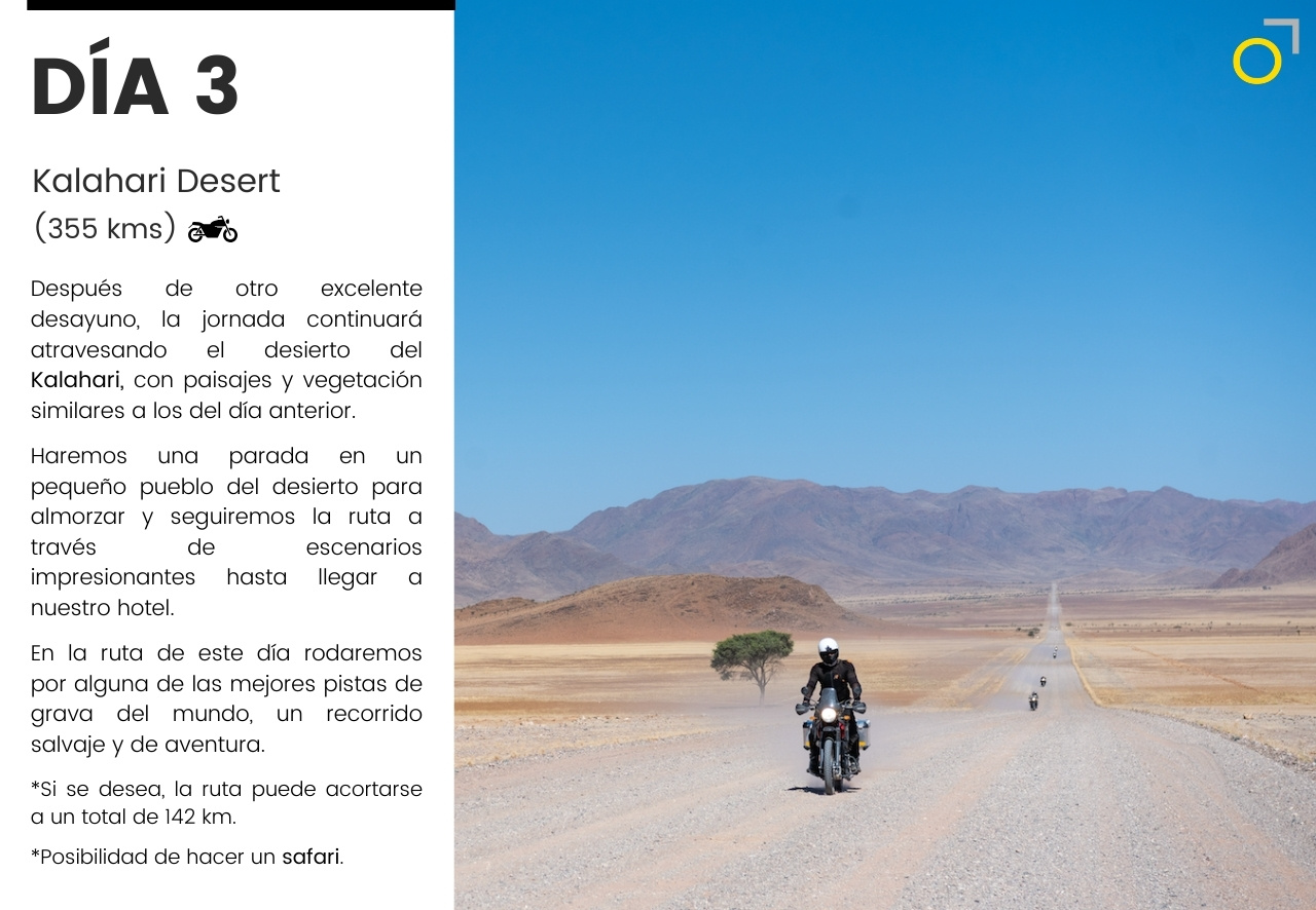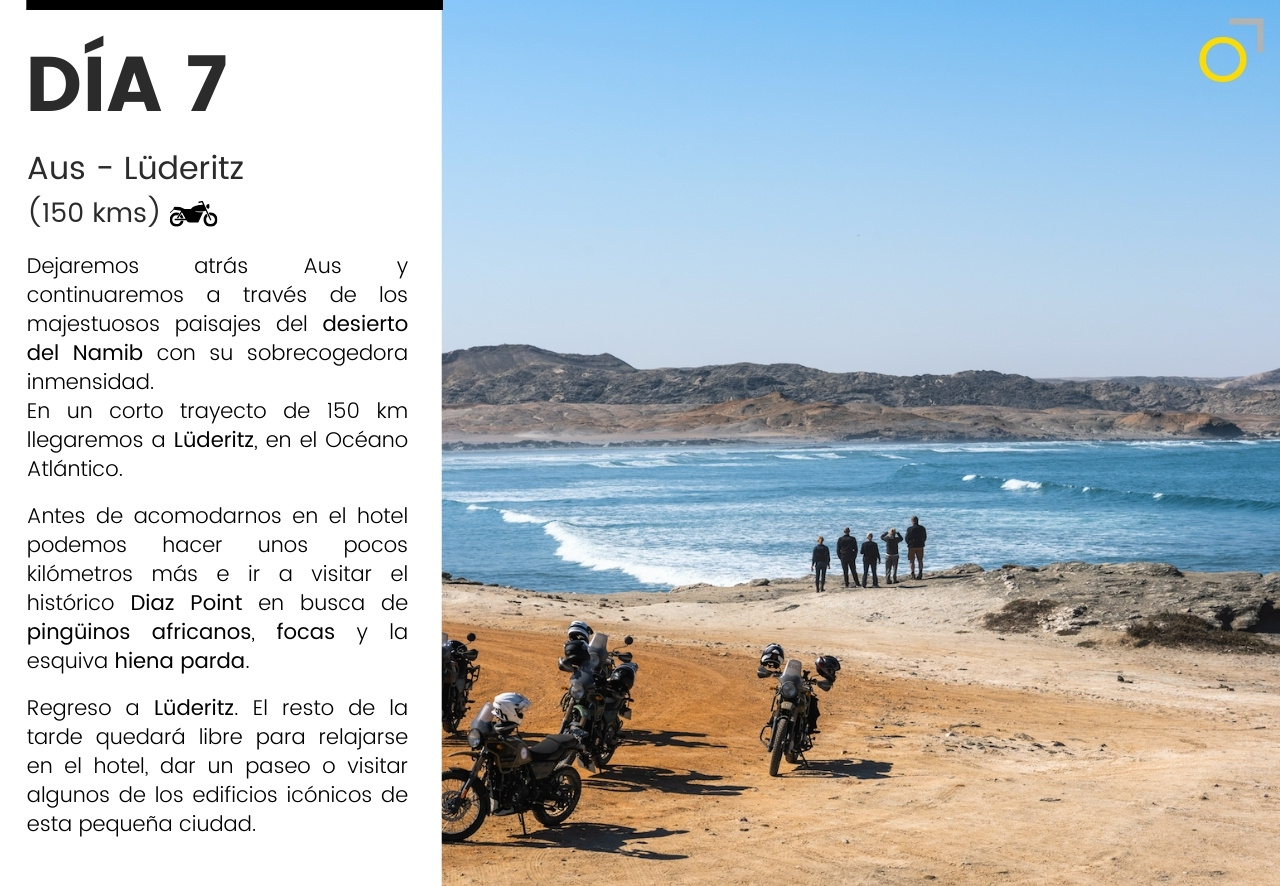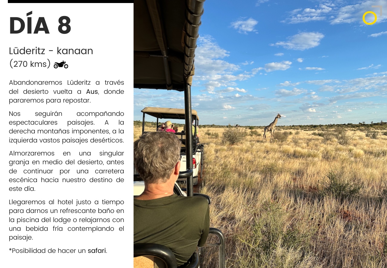 Un viaje en moto por Namibia: desiertos infinitos, pistas remotas y la fuerza salvaje de la costa atlántica. Una aventura que combina conducción, naturaleza y safaris para descubrir la fauna africana en libertad. Un recorrido único para quienes buscan emoción y paisajes inolvidables.