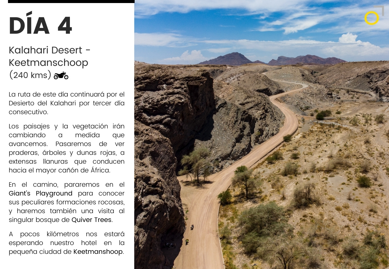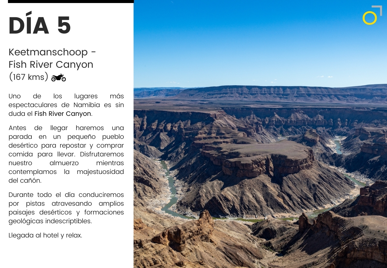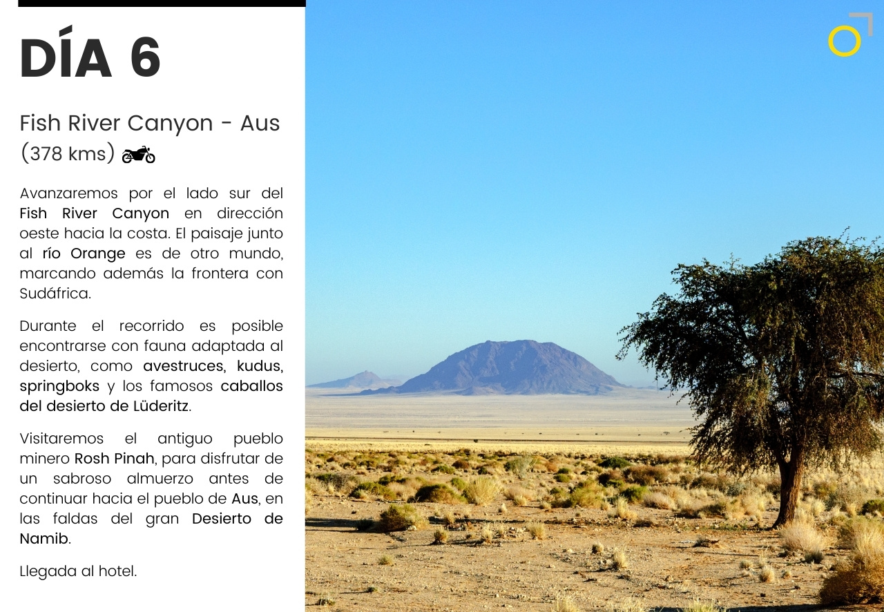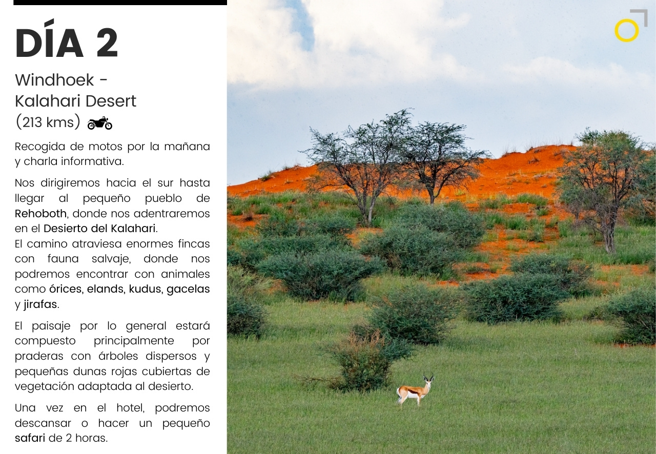 Un viaje en moto por Namibia: desiertos infinitos, pistas remotas y la fuerza salvaje de la costa atlántica. Una aventura que combina conducción, naturaleza y safaris para descubrir la fauna africana en libertad. Un recorrido único para quienes buscan emoción y paisajes inolvidables.
